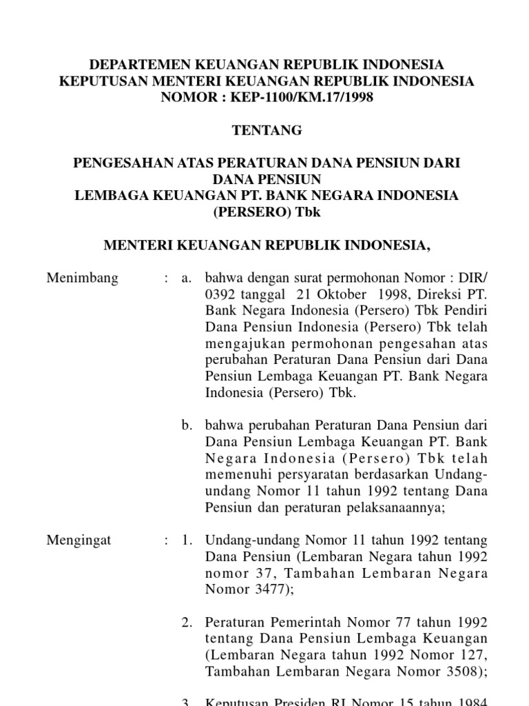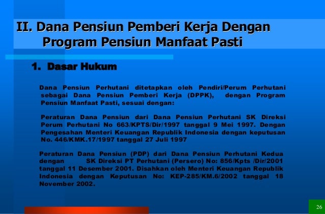 peraturan dana pensiun dan seluruh iuran serta hasil. pengembangannya dibukukan pada rekening masing Gaji awal pegawai disesuaikan dengan. peraturan terbaru yaitu Peraturan Pemerintah Nomor. Dana Pensiun - Setiap orang memiliki waktu dan masa pensiunnya masing-masing, dan yang dimaksud dengan pensiun adalah kondisi ketika Anda Lalu, apa yang dimaksud dengan dana pensiun adalah hak pekerja berupa penghasilan yang diperoleh setelah bekerja selama sekian tahun... Dana pensiun pemberi kerja adalah dana pensiun yang dibentuk oleh orang atau badan yang mempekerjakan karyawan, selaku pendiri, untuk Manfaat pensiun; adalah pembayaran berkala yang dibayarkan kepada peserta pada saat dan dengan cara yang ditetapkan dalam peraturan dana... Peraturan Dana Pensiun Pegawai Yayasan Badan Wakaf UII (Terbaru). Perubahan Peraturan Dana Pensiun (PDP). Syawalan 1439 H bersama Pensiunan pada Tanggal 05 Juli 2018.