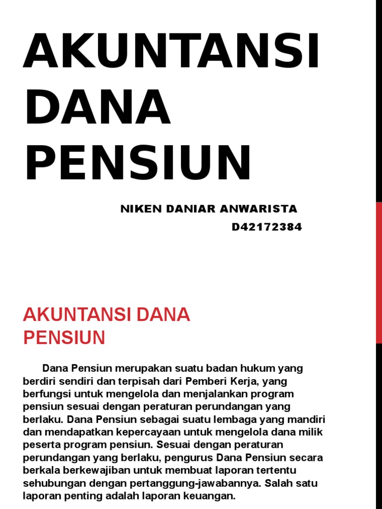 Ini pembahasan dana pensiun pengertian, fungsi, jenis-jenis pensiun dan dana pensiun, hingga cara menghitungnya. Adanya undang-undang tentang dana pensiun ini bertujuan untuk menetapkan hak peserta, menetapkan standar peraturan yang dapat menjamin diterimanya dana-dana pensiun tepat... PENGERTIAN DANA PENSIUN David L. Scott (1988) Dana pensiun adalah lembaga keuangan yang mengendalikan aset dan mencairkan pendapatan kepada orang-orang setelah mereka pensiun dari pekerjaan yang menguntungkan FE Perry (1983)... Peraturan dana pensiun dari dana pensiun perhutani. Ingin mencari bacaan Dana Pensiun dengan pilihan koleksi & edisi terbaru & terlengkap? Cek Aneka Rekomendasi Dana Pensiun Terlengkap & Terbaik Lainnya.