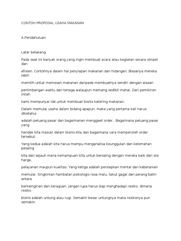 Contoh proposal usaha bisnis. Oct 10, 2018 - Contoh Proposal Bisnis Bahan pendukung Pelatihan Teknopreneur & Kewirausahaan dan Model Bisnis 30 April 2014. Kumpulan Contoh Proposal Usaha & Bisnis Lengkap. Dalam membuat usaha ada bermacam-macam bentuknya. sehingga u ntuk membuat contoh proposal usaha lengkap, dibutuhkan sentuhan yang berbeda juga. Hal ini karena setiap usaha memiliki target tujuan dan analisis yang berbeda-beda. Masing-masing bisnis atau usaha juga memiliki cara penanganan yang ... Contoh proposal usaha digunakan untuk mempermudah pelaku bisnis dalam menjalankan usaha berisi panduan secara rinci dan jelas. Dalam suatu bidang usaha, tentunya harus memuat estimasi modal dan analisis SWOT yang berbeda. Yuk, simak contoh proposal pengajuan modal usaha ke investor yang baik dan benar berikut ini! 4 Contoh Proposal Usaha Lengkap 1. No information is available for this page.Learn why