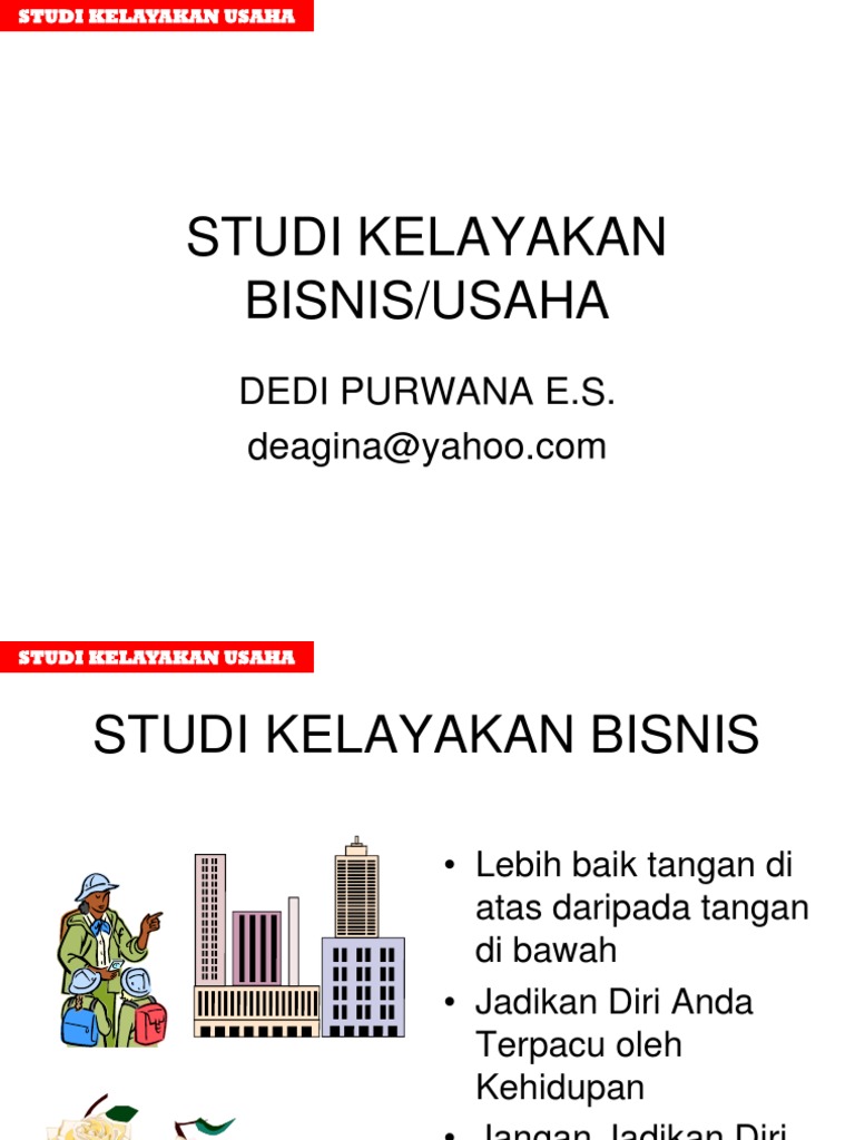 9 Materi Studi Kelayakan Bisnis Pdf. Ditulis Anonim Sabtu, 20 Juni 2015 Tulis Komentar. Edit. Usulan rencana bisnis program mahasiswa wirausaha peternakan kambing potong diajukan oleh mohamad r. Pengertian studi kelayakan perusahaan studi kelayakan perusahaan atau studi kelayakan proyek atau studi kelayakan bisnis adalah penelitian tentang ...