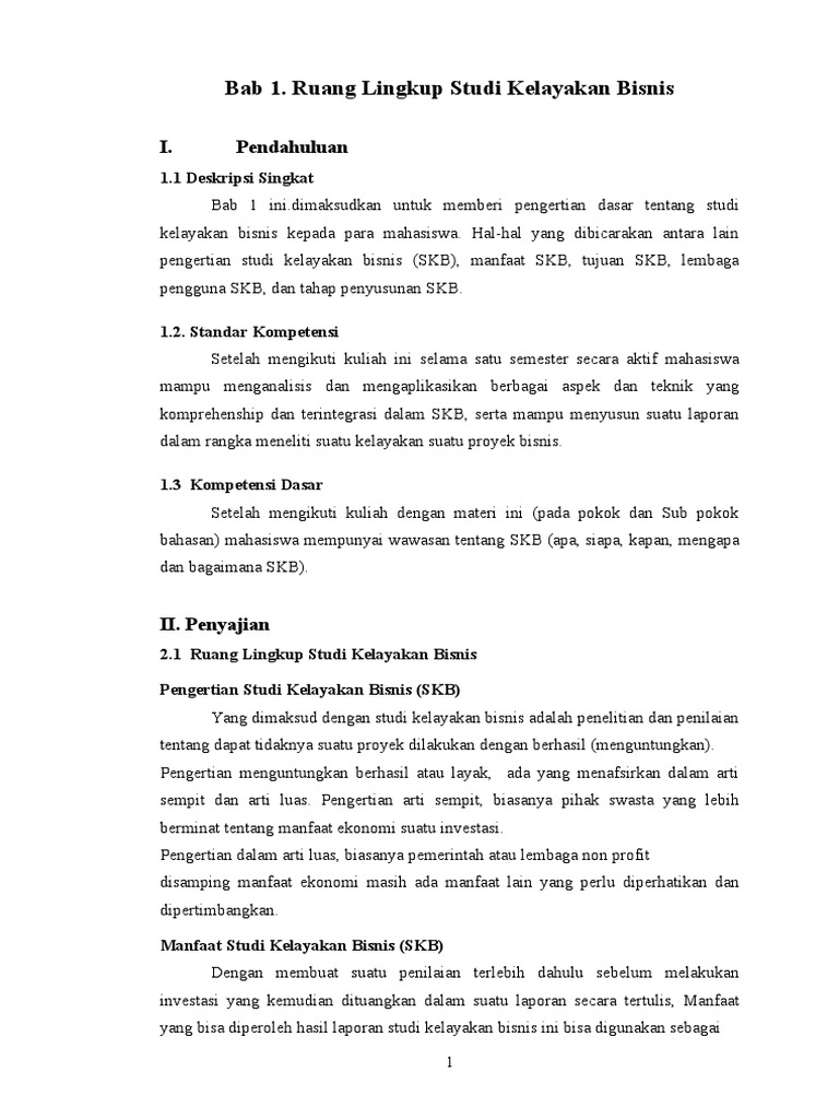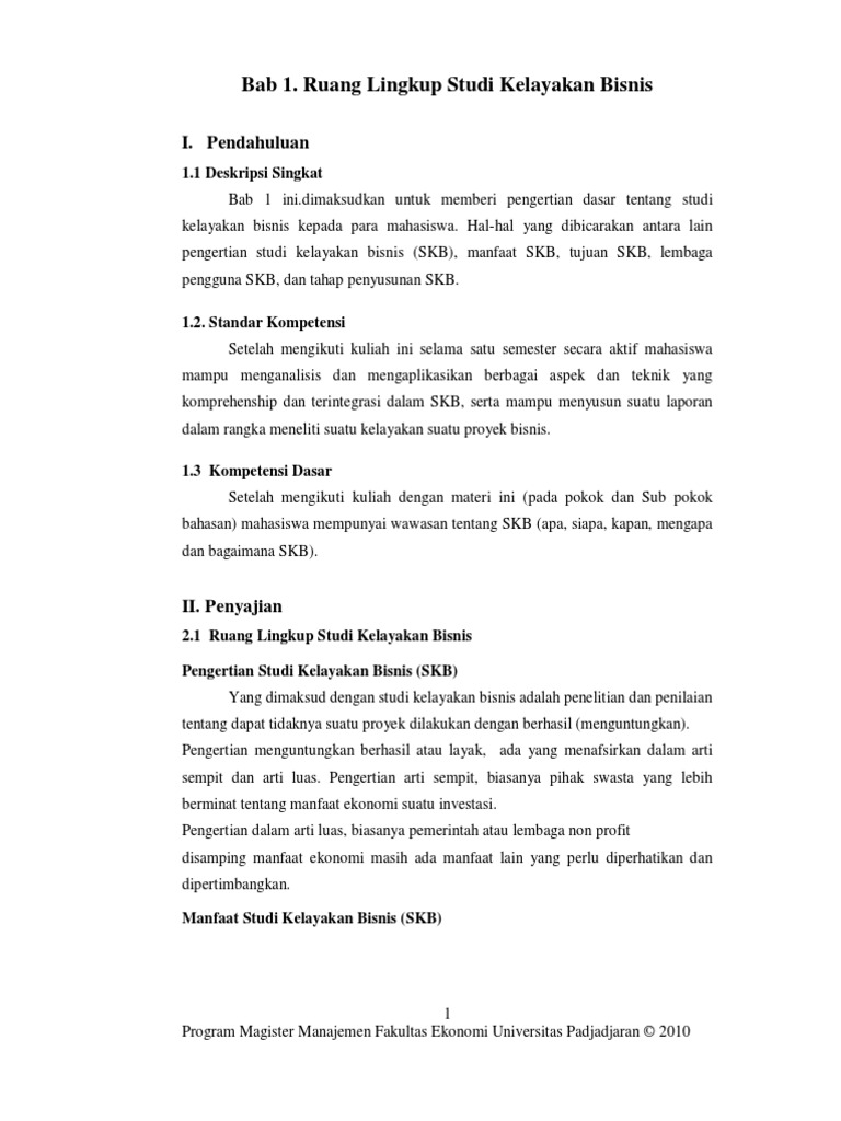 Menyusun Rencana Usaha serng kali disebut juga sebagai Studi Kelayakan Bisnis, maksudnya adalah mempelajari apakah suatu bisnis itu dipelajarai dan dianalisa apakah bisnis yang kita rencanakan layak atau tidak untuk dijalankan. ... Materi Kuliah Studi Kelayakan Bisnis PPT. 1. KONTRAKPERKULIAHANSKB.pdf (Klik Disini) 2. skb1.pdf (Klik Disini) 3 ...