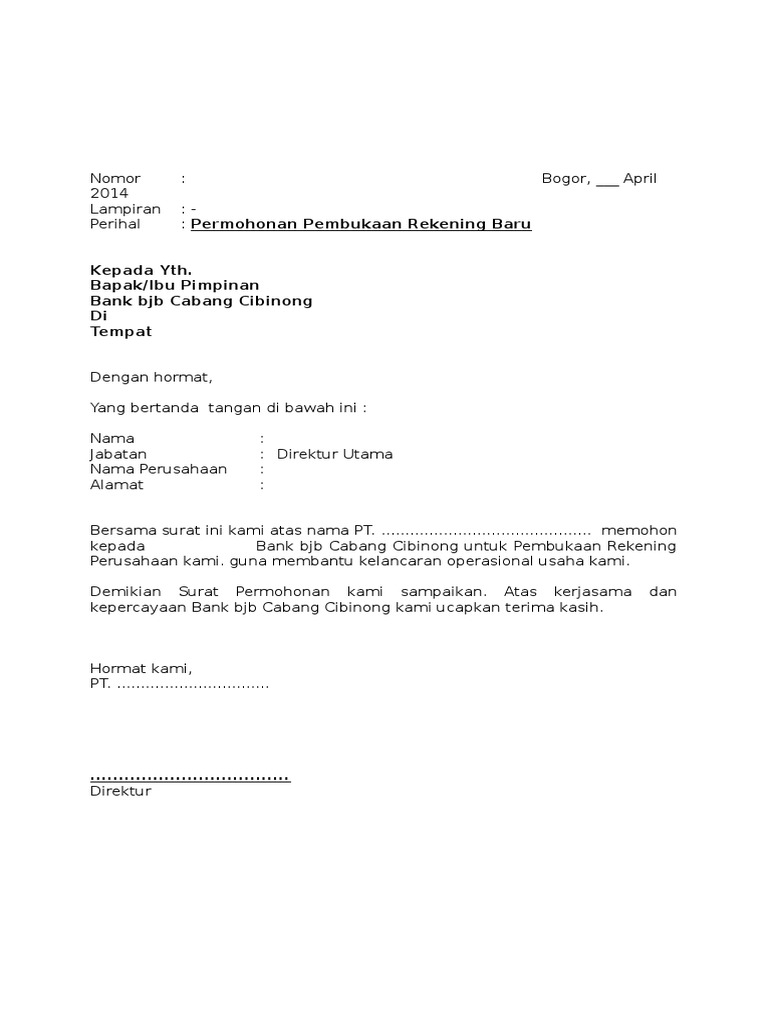 6. Contoh Surat Permohonan Kerjasama Pembukaan Rekening Contoh Surat Permohonan Kerjasama - Sebagai suatu perusahaan yang ingin maju dan berkembang, maka tentu harus menjalin kerjasama dengan perusahaan lain maupun Kerjasama yang dimaksud adalah dalam bentuk pembukaan rekening bank untuk seluruh karyawan di PT. 5. Contoh Surat Permohonan Pembukaan Rekening Giro Bank BJB 1. Contoh Surat Pembukaan Rekening Giro Bank Jatim. Bank Jatim adalah salah satu Bank yang banyak ditunjuk oleh pemerintah sebagai bank penyalur bantuan Hormat saya, Sulasmi Owner Sulasmi Fashion Store. 2. Contoh Surat Permohonan Pembukaan Rekening Giro Perusahaan.