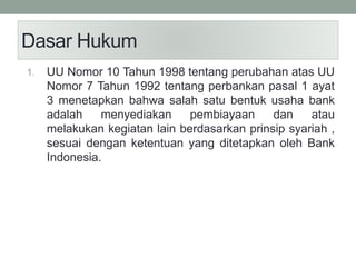 Menurut M. Syafeí Antonio Bank Syariah atau Bank Islam adalah lembaga keuangan yang tata cara operasinya dan produk yang dikembangkan berlandaskan pada AlQuran dan Hadits atau sesuai dengan prinsip syariat islam. Sedangkan menurut Undang-Undang Pasal 2 PBI No. 6/24/PBI/2004 Tentang Bank Umum yang Melaksanakan Kegiatan Usaha Berdasarkan Prinsip ...