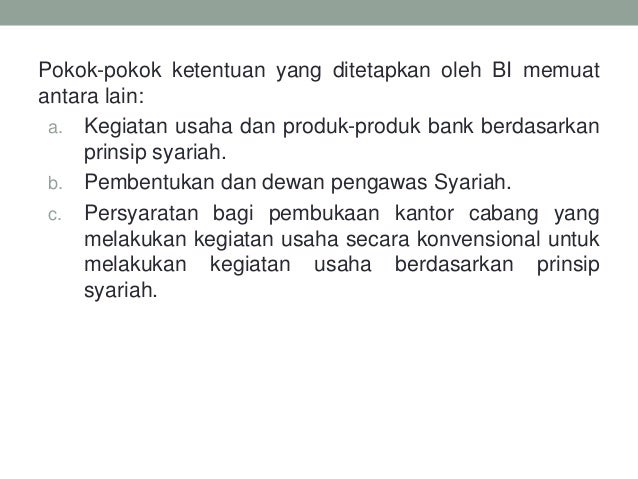 Bank yang berdasarkan prinsip syariah mendapatkan hasil dari. Indonesia, dan bank umum syariah dan bank pembiayaan ... Undang mengenai perbankan syariah. ... (5) Berdasarkan hasil penelitian perizinan sebagaimana.96 pages Nah, perbankan syariah melakukan perhitungan bagi hasil dengan cara profit sharing, yaitu membagi keuntungan bersih dari usaha atau investasi yang sudah dijalankan. Besarnya keuntungan untuk pihak bank dan nasabah sudah diputuskan saat akad akan ditandatangani. Jadi tidak ada kebingungan dan cek cok lagi saat bisnis atau usaha selesai dijalankan. by K Soetopo · Cited by 4 — Salah satu prinsip usaha Perbankan Syariah adalah akad Bagi Hasil dan risiko dimana bank dan nasabah membagi keuntungan berdasarkan rasio Bagi Hasil yang ...17 pages Secara umum terdapat 11 prinsip bank syariah yang dianut berdasarkan hukum islam, diantaranya : Prinsip Bank Syariah 1. Mudharabah Adalah suatu bentuk kerjasama usaha antaa mudharib (pengelola dana) dengan mudharib (pengelola dana) dengan nisab bagi hasil antara keduanya yang telah ditetapkan berdasarkan kesepakatan diawal.
