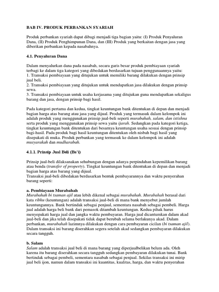 Produk Bank Syariah. Berikut merupakan jenis-jenis produk dari bank syariah yang ditawarkan: 1. Al-wadi'ah (Simpanan) Al-wadi'ah adalah titipan atau simpanan pada bank syariah. Prinsip Al-wadi'ah adalah titipan murni dari suatu pihak ke pihak lain.. Baik perorangan atau pun badan hukum yang harus dijaga dan dikembalikan kapan saja jika si penitip menghendaki.