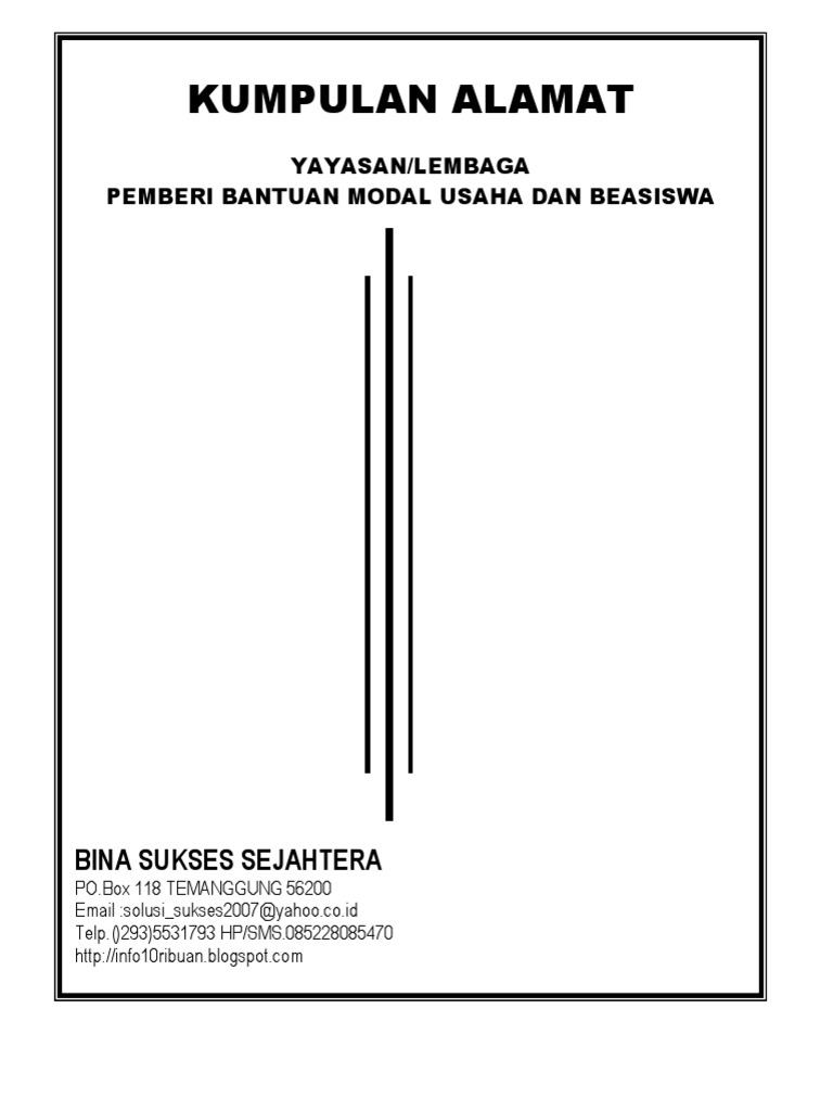 ANDA SEDANG MENCARI INFO ALAMAT LEMBAGA DONATUR PEMBERI BANTUAN MODAL DAN BEASISWA? Pertanyaan utama yang dihadapi semua Organisasi non pemerintah (Ornop/LSM), para mahasiswa paska sarjana, para peneliti dan para penggiat kegiatan social di masyarakat ialah di mana dan bagaimana caranya mengumpulkan dana untuk More. Page 1 of 1. 1.