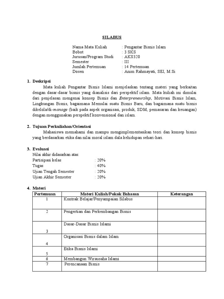pengantar bisnis mata kuliah ini dirancang untuk membahas konsep-konsep bisnis dasar (basic business concept) dalam konteks global yang selalu mengalami perubahan. materi pembahasan mencakup semua fase penting dalam bisnis seperti lingkungan bisnis, kepemilikan bisnis, aspek-aspek pengoperasian, pengorganisasian, pengelolaan financial, marketing dan berbagai fungsi utama dalam bisnis. Deskripsi Mata Kuliah Mata Kuliah ini memberikan bekal pengetahuan, pengertian serta pemahaman kepada para mahasiswa agar menguasai wawasan, ruang lingkup berbagai konsep-konsep bisnis. Konsep bisnis ini diperlukan sebagai bekal dasar untuk mempelajari pengetahuan bisnis yang lebih rinci pada studi lanjutan .